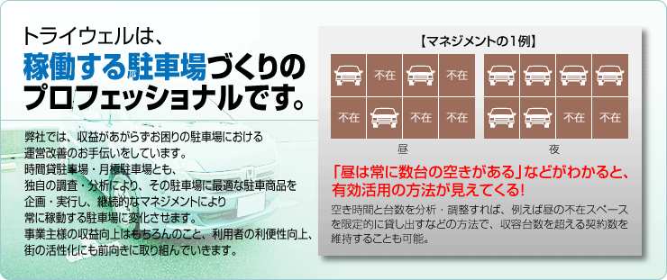 稼働する駐車場づくりは、市場調査と現状分析(Dr.パーキング)をもとに、立地条件等に合う最適なプランの組み立てから始まります。プラン実行後は、継続的に事業地を視察し、効果を確認。街の変化を肌で感じ取りながら、企画→実行→検証を飽くことなく繰り返していきます。