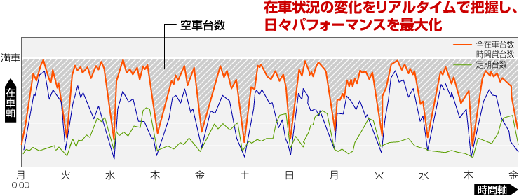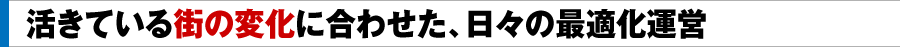 コンピュータで状況を数値化し、最適化することも重要ですが、それだけでは街や人の些細な変化に気づくことはできません。スタッフによる実際のフットワークで得た情報から、駐車商品の変更・新商品の供給や、運営形態・台数等に至るまで、常にその瞬間の最適化運営を行っていきます。